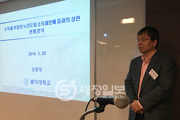 25일 서울시 중구 세종대로 대한상공회의소에서 열린 한국재정학회(회장 김정훈) 2016년도 춘계정기학술대회에서 성명재 홍익대학교 경제학부 교수는 ‘소득세 부담의 누진도와 소득재분배 효과의 상관관계 분석’에 대한 연구논문을 발표했다.