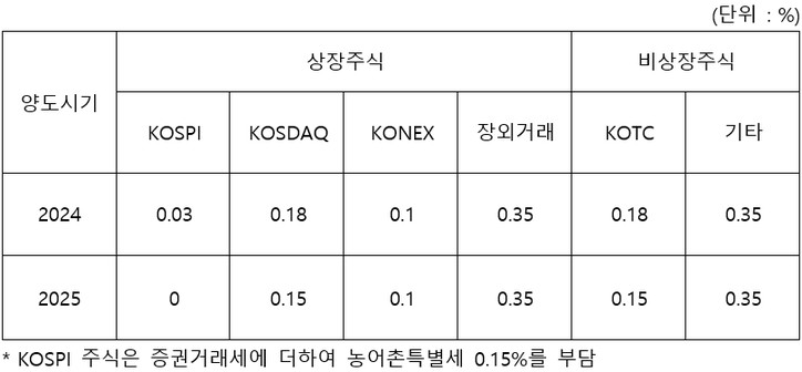 예를 들어 유가증권시장에 상장된 주식을 장내매도시 2024년까지는 0.03%의 증권거래세와 0.15%의 농어촌특별세를 내는 것입니다. 2025년에는 농어촌특별세만 내게 됩니다.