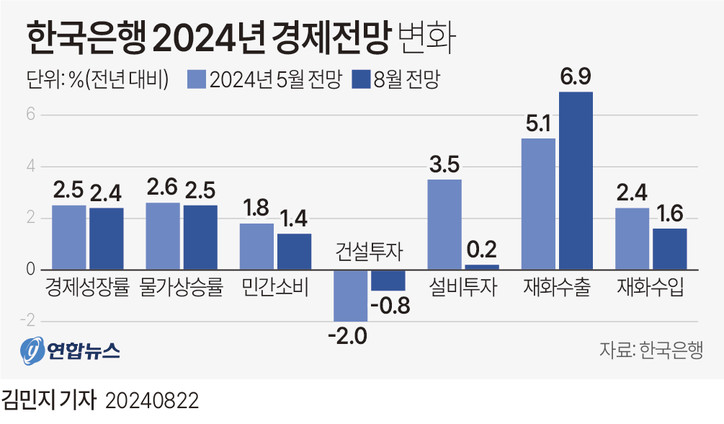 24일 연합뉴스가 경제 전문가 6명을 대상으로 설문 조사한 결과, 대부분 한은이 올해 성장률 전망치를 기존 2.4%에서 2.2%로 낮출 것으로 예상했다.