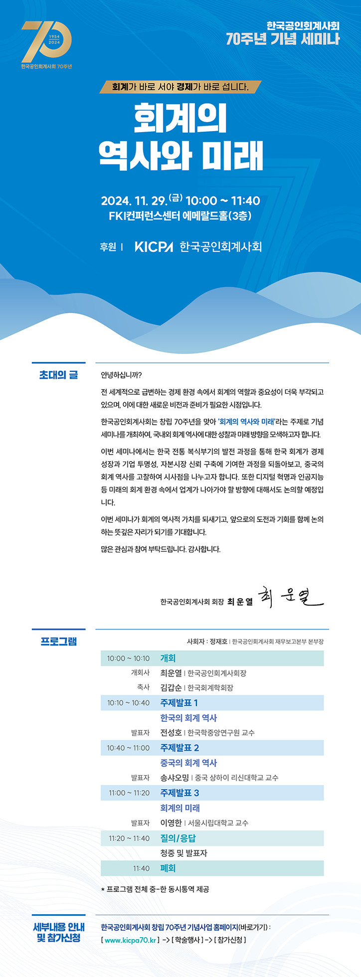 이번 세미나는 한국공인회계사회 70주년 기념 사업 홈페이지(www.kicpa70.kr)에서 사전 신청할 수 있다. 세미나 종료 후 한국공인회계사회 회계연수원 및 유튜브 채널에 녹화 영상을 업 로드할 예정이다.