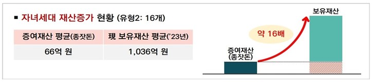 이번 조사대상 자녀들은 증여 받은 종잣돈 평균 66억원을 시작으로, 부당 지원 등을 통해 5년 만에 재산이 평균 1036억원(최대 6020억원)으로 증가하였음에도 세법에서 정하는 증여세를 제대로 신고하지 않았다. 현행 상증세법상 부모소유 기업이 자녀회사에 일감을 몰아주거나 거래처를 떼어주어 이익이 발생하는 경우 자녀에게 증여세가 과세된다.