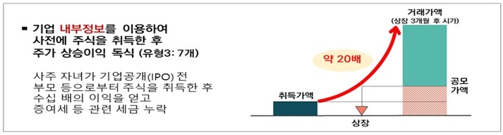 세 번째 대상은 기업공개(IPO), 신규 사업 진출 등 기업의 미공개 정보를 이용해 부당하게 시세차익을 얻은 기업 및 사주일가이다.