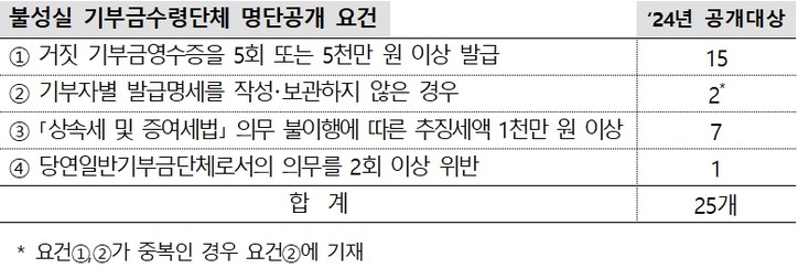 이번에는 기부금영수증에 단가를 매겨 수백 회에 걸쳐 거짓기부금영수증을 판매한 종교단체, 증여세를 면제받은 출연재산을 3년 내에 공익목적 사업에 사용하지 않고 나대지로 방치해 1000만 원 이상 증여세를 추징당한 단체 등 25개를 공개했다.