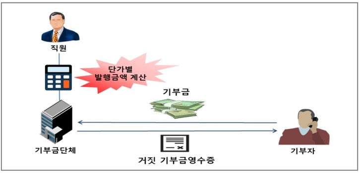 -실제 수령한 기부금액과 발급금액이 상이하고, 기부금영수증 발행금액별로 단가가 적힌 메모지가 발견되는 등 다수의 거짓 기부금영수증을 발급함