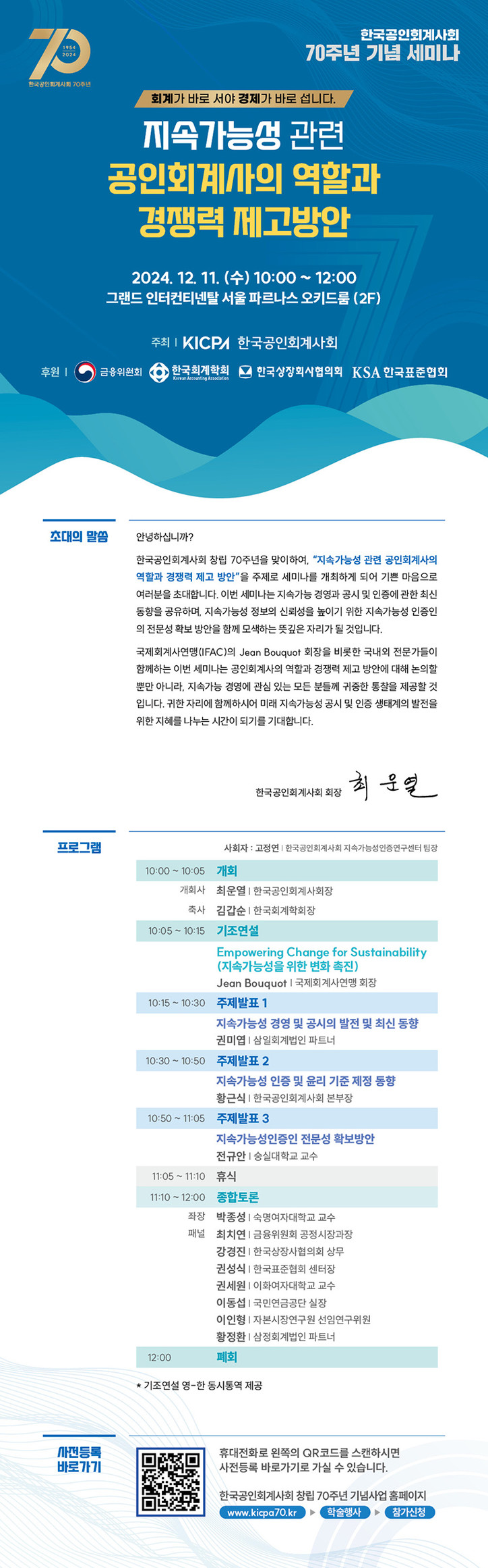 이번 세미나는 지속가능성 시대에 공인회계사가 수행해야 할 역할을 심도 있게 논의하는 자리로, 국내외 지속가능성 전문가와 이해관계자가 참여한다.
