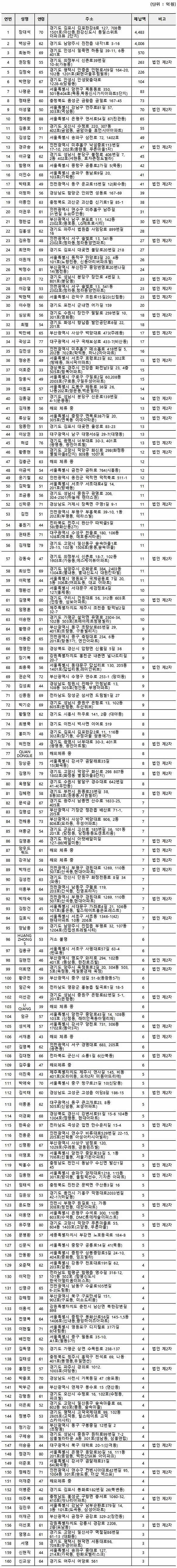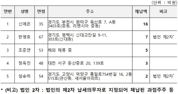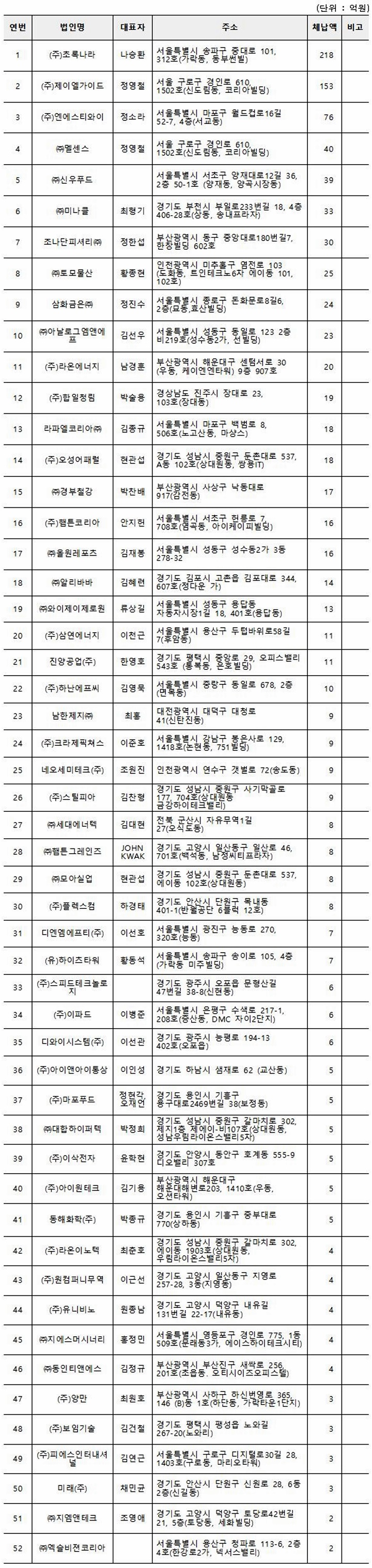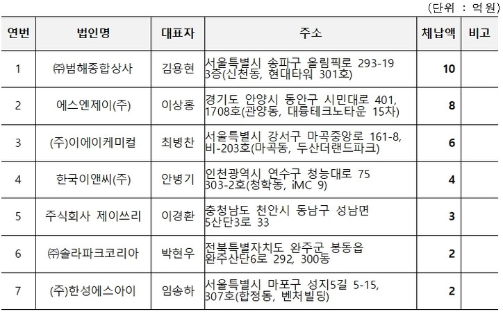 □ 신규 공개 개인 5명(체납액 33억 원) □ 신규 공개 법인 7개 업체(체납액 35억 원) □ 공개유지 개인 160명(체납액 11,591억 원) □ 공개유지 법인 52개 업체(체납액 1,012억 원)