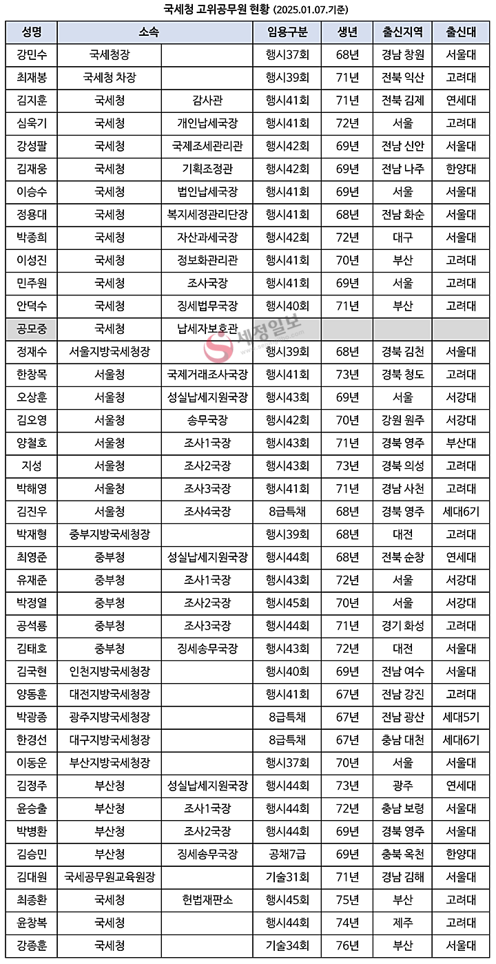 고공단 내 세대 출신은 세대5기(박광종 광주청장)와 세대6기(한경선 대구청장, 김진우 서울청 조사4국장) 뿐이다.