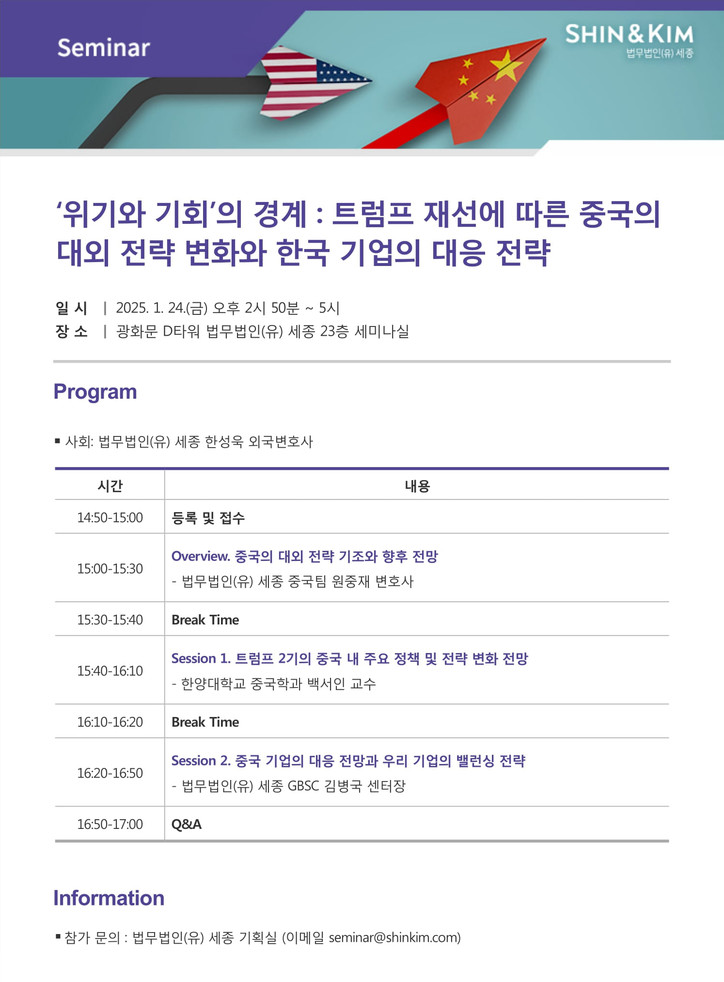 법무법인(유) 세종(오종한 대표변호사)은 오는 24일, ‘트럼프 재선에 따른 중국의 대외 전략 변화와 한국 기업의 대응 전략’을 주제로 세미나를 개최한다고 밝혔다.