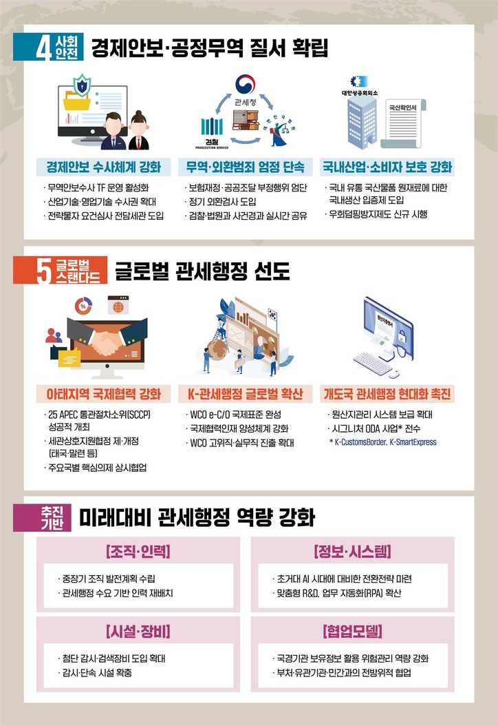 특히 지난해부터 운영 중인 본청 무역안보수사 TF를 더욱 활성화하여 무역을 매개로 산업기술·영업비밀 등을 해외로 유출하는 행위에 대해 관세청의 수사 기능을 확대하는 한편, 외환시장의 질서를 확립하고 기업의 외국환거래 법규준수 리스크를 완화하기 위하여 일정규모 이상 외환거래 업계를 주기적으로 점검하는 정기 외환검사 제도가 신규 도입된다.