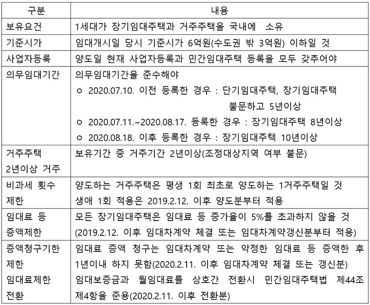 양도일 현재 장기임대주택과 거주주택을 보유한 거주자가 거주주택(2년이상 보유 및 2년이상 거주)을 양도하는 경우 장기임대주택은 주택으로 보지 않고 거주주택을 1세대 1주택으로 보아 양도소득세를 비과세합니다. 2019.2.12. 이후 거주주택 취득분부터는 생애 한 차례만 거주주택 비과세를 적용받을 수 있습니다.