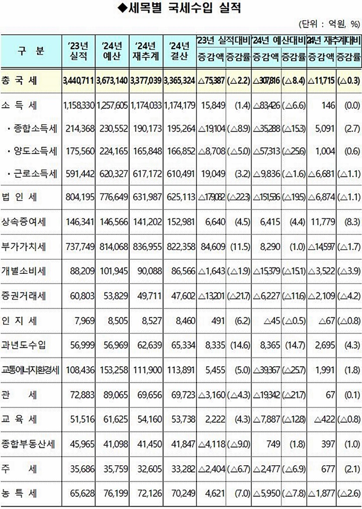 세목별로 보면, 지난해 기업실적 감소로 법인세가 62조5000억원이 걷히면서 전년보다 17조9000억원이 줄었다. `23년 상장사 영업이익이 `22년 대비 44.2%가 감소하면서 세수 감소에 큰 영향을 미친 것으로 분석됐다. 본예산보다 15조2000억원이 덜 걷힌 셈이다.