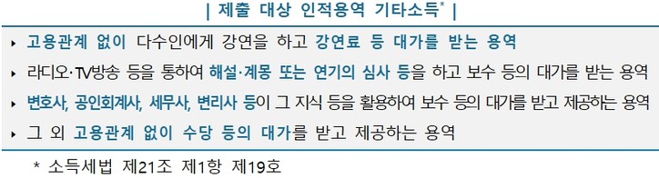 기타소득 간이지급명세서 제출대상은 일시적으로 강연, 자문 등 인적용역을 제공받고 대가를 지급하는 자이며, 제출기한은 지급일이 속하는 달의 다음 달 말일이다. 예를 들어, 올해 1월에 강연료나 자문료 등을 지급했다면 2월28일까지 제출해야 한다.