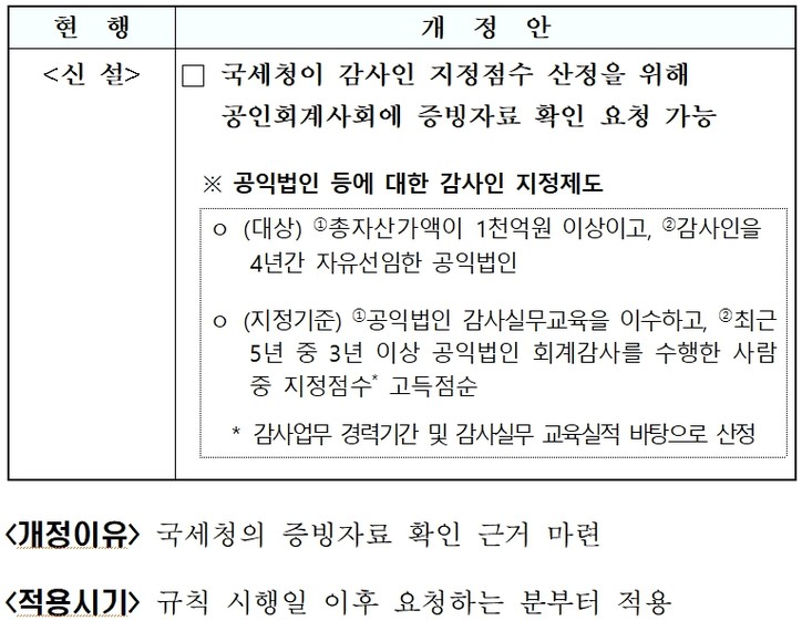 또한 국세청이 감사인 지정점수 산정을 위해 공인회계사회에 증빙자료 확인 요청이 가능해진다.