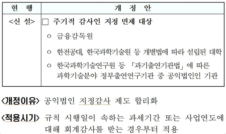 공익법인 주기적 감사인 지정 면제 대상이 규정된다. △금융감독원 △한전공대, 한국과학기술원 등 개별법에 따라 설립된 대학 △한국과학기술연구원 등 과기출연기관법에 따른 과학기술분야 정부출연연구기관 중 공익법인인 기관은 주기적 감사인 지정 면제 대상이다.
