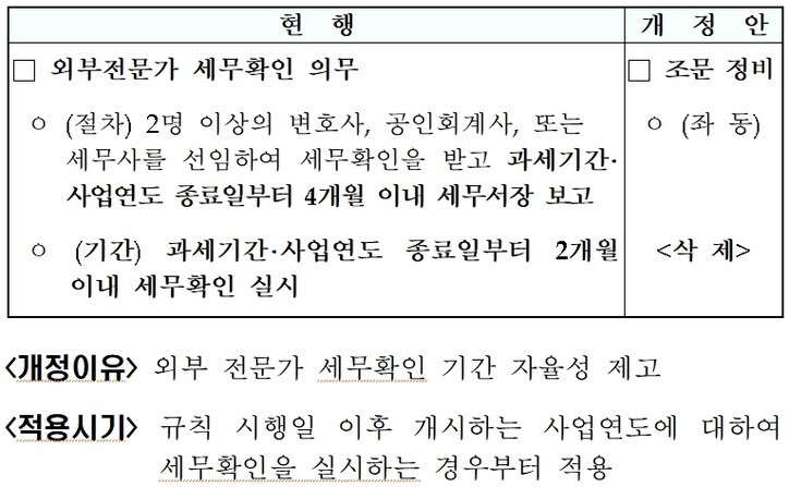 공익법인은 2명 이상의 변호사, 공인회계사, 세무사 등을 선임해 세무확인을 받고 과세기간 및 사업연도 종료일부터 4개월 이내 세무서장에게 보고해야 한다. 외부전문가는 과세기간 및 사업연도 종료일부터 2개월 이내 세무확인을 실시해야 하는데, 이 기간을 삭제해 기간 자율성을 제고한다.