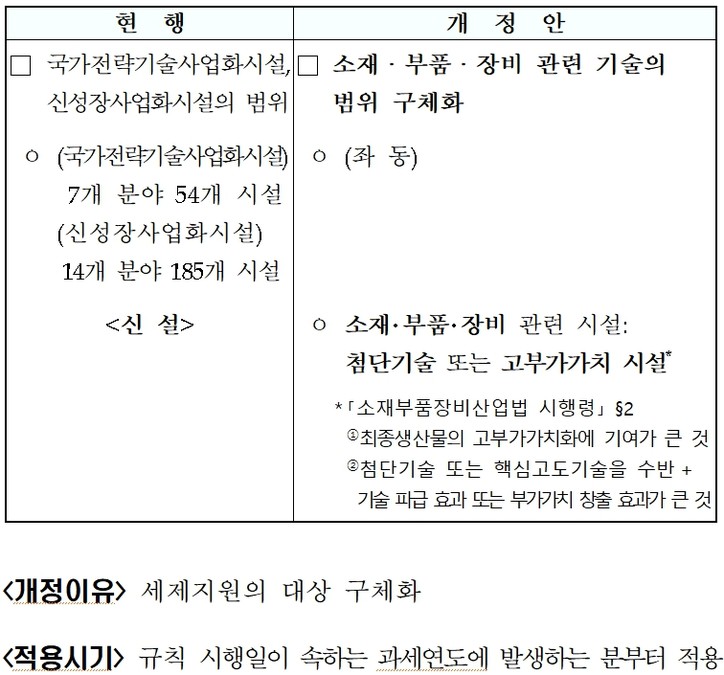 (17) 국가전략기술사업화시설, 신성장사업화시설의 대상이 되는 소재・부품・장비 관련 시설의 범위 구체화(조특칙 별표6, 별표6의2)