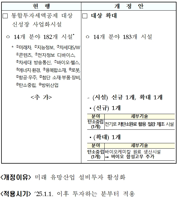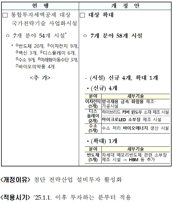 현행 반도체, 이차전지, 백신, 디스플레이, 수소, 미래형이동수단, 바이오의약품 7개 분야에 54개 시설이 대상이다. 개정안에 따르면 반도체 분야에 차세대 메모리반도체 관련 소부장 제조 시설 HBM 등이 추가되고, 디스플레이 분야에 차세대 메모리반도체 관련 소부장 제조 시설이 추가되며, 수소 분야에 수소 처리 바이오에너지 생산 시설이, 이차전지 분야에 양극재용 금속 화합물 제조・가공시설이 추가된다.