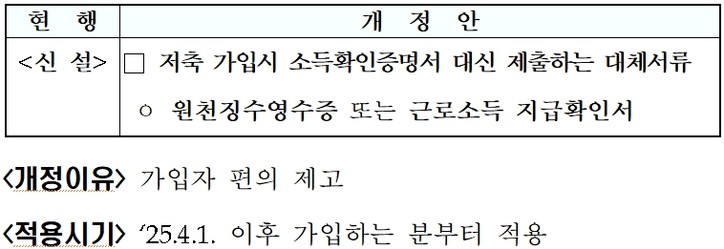 ㅇ 다만, 소득확인증명서로 과세특례 요건 충족 여부 확인이 어려운 경우*, 시행규칙으로 정하는 자료를 우선 제출하고 가입연도 말일까지 소득확인증명서 추가 제출 필요