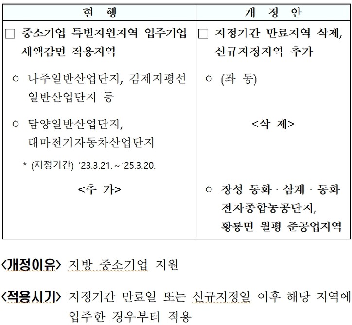 중소기업 특별지원지역 입주기업 세액감면 적용지역에 ‘장성 동화·삼계·동화전자종합농공단지, 황룡면 월평 준공업지역’이 추가되고, 담양일반산업단지 및 대마전기자동차산업단지는 삭제된다.