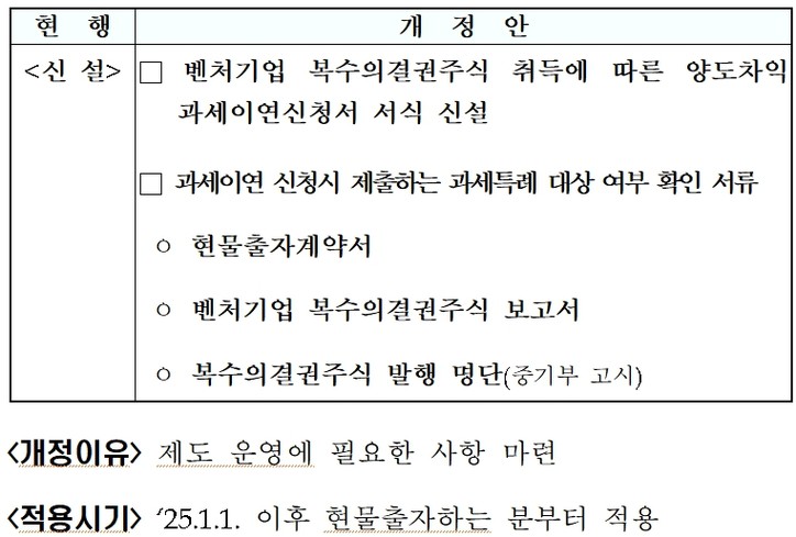 □ 벤처기업 복수의결권주식* 취득시 현물출자로 발생한 양도소득에 대해 과세이연 신청을 하려는 자는 시행규칙으로 정하는 과세이연신청서 및 과세특례 대상 여부 확인 서류 제출 필요
