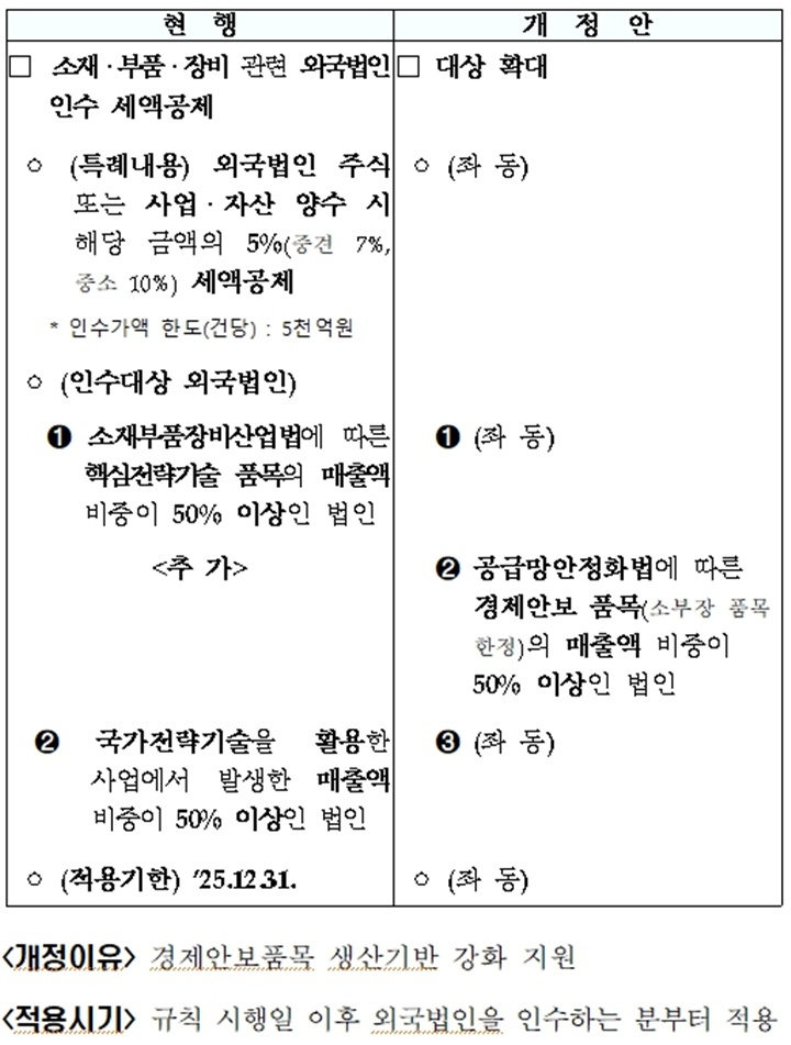 소재・부품・장비 외국법인 인수 세액공제 범위도 공급망안정화법에 따른 경제안보 품목(소부장 품목 한정)의 매출액 비중이 50% 이상인 법인이 추가된다.