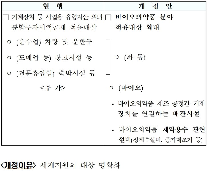 바이오의약품 분야 통합투자세액공제 대상에 △바이오의약품 제조 공정간 기계 장치를 연결하는 배관시설 △바이오의약품 제약용수 관련 설비 등이 추가된다.