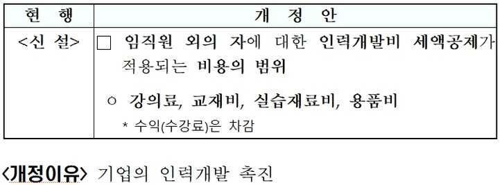 사내 교육프로그램을 청년 등 일반에게 제공하기 위해 추가로 소요되는 비용에 대해 인력개발비 세액공제를 적용한다. 세액공제가 적용되는 비용의 범위로는 강의료, 교재비, 실습재료비, 용품비가 포함된다.