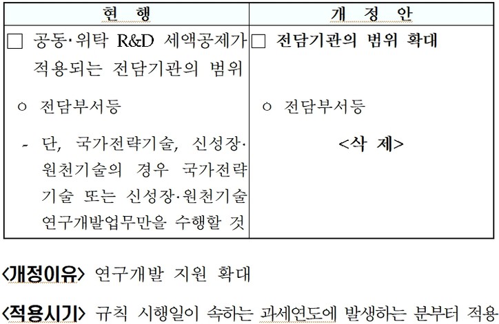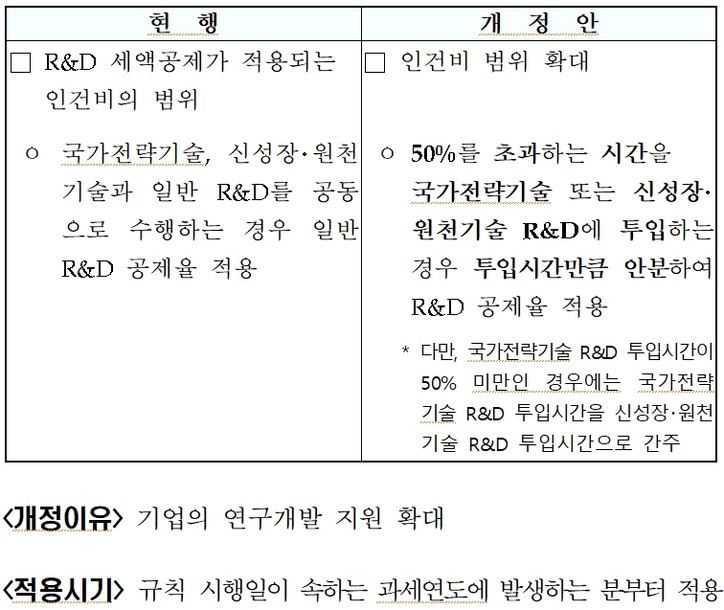 국가전략기술 R&D 세액공제 적용범위도 확대된다. 현행은 국가전략기술, 일반 R&D를 동시에 연구한 인력에 대해 일반 R&D 세액공제율 적용 중이며, 개정안은 50% 이상의 시간을 국가전략기술 R&D에 투입한 경우 실제 연구시간으로 안분해 국가전략기술 R&D 공제율 적용토록 했다.