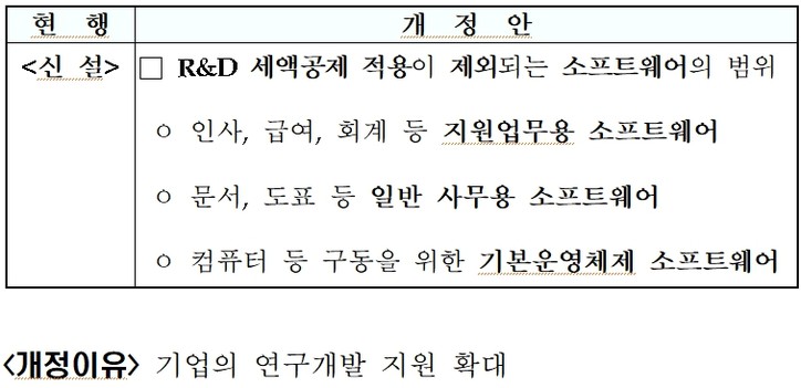 □ R&D 세액공제 대상이 되는 소프트웨어 대여・구입비의 적용범위를 확대*하되, 일반 사무용 소프트웨어는 제외됨을 명확화