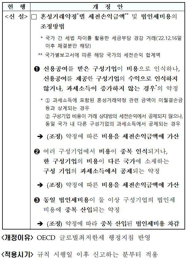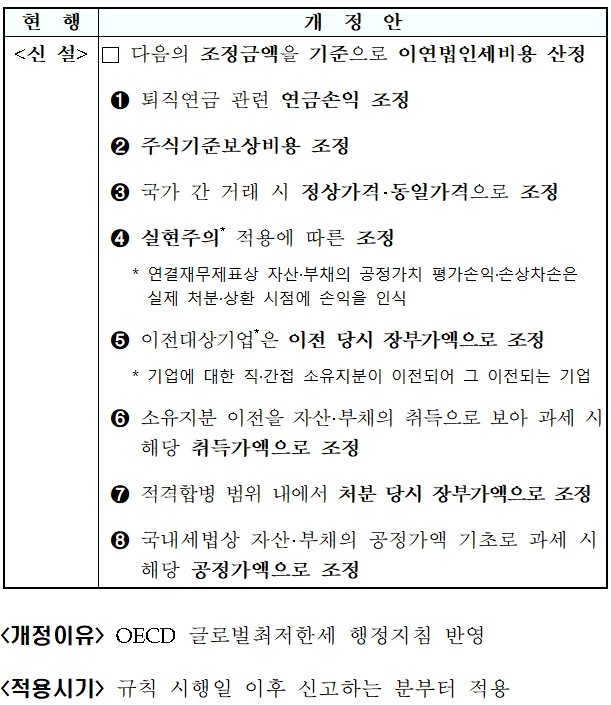 글로벌최저한세 도입을 앞두고 글로벌최저한세가액 기준 이연법인세 비용 산정도 시행규칙에 위임했다. 이에 따라 △퇴직연금 관련 연금손익 조정 △주식기준보상비용 조정 △국가 간 거래 시 정상가격·동일가격으로 조정 △실현주의 적용에 따른 조정 △이전대상기업은 이전 당시 장부가액으로 조정 △소유지분 이전을 자산·부채의 취득으로 보아 과세 시 해당 취득가액으로 조정 △적격합병 범위 내에서 처분 당시 장부가액으로 조정 △국내세법상 자산·부채의 공정가액 기초로 과세 시 해당 공정가액으로 조정 등의 조정금액을 기준으로 이연법인세비용을 산정한다.
