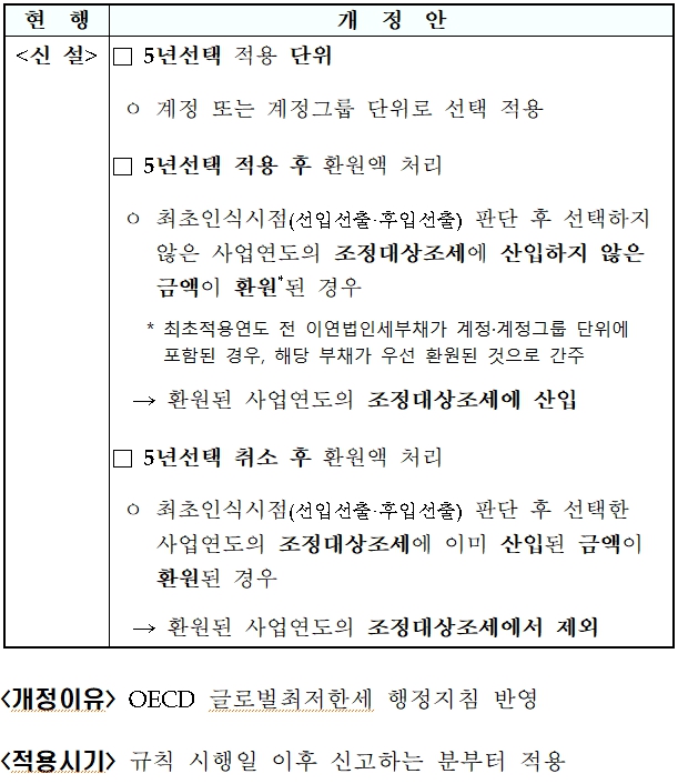 □ 5년내 환원되지 않는 이연법인세비용은 신고구성기업이 매년선택, 5년선택하여 조정대상조세에서 제외 가능