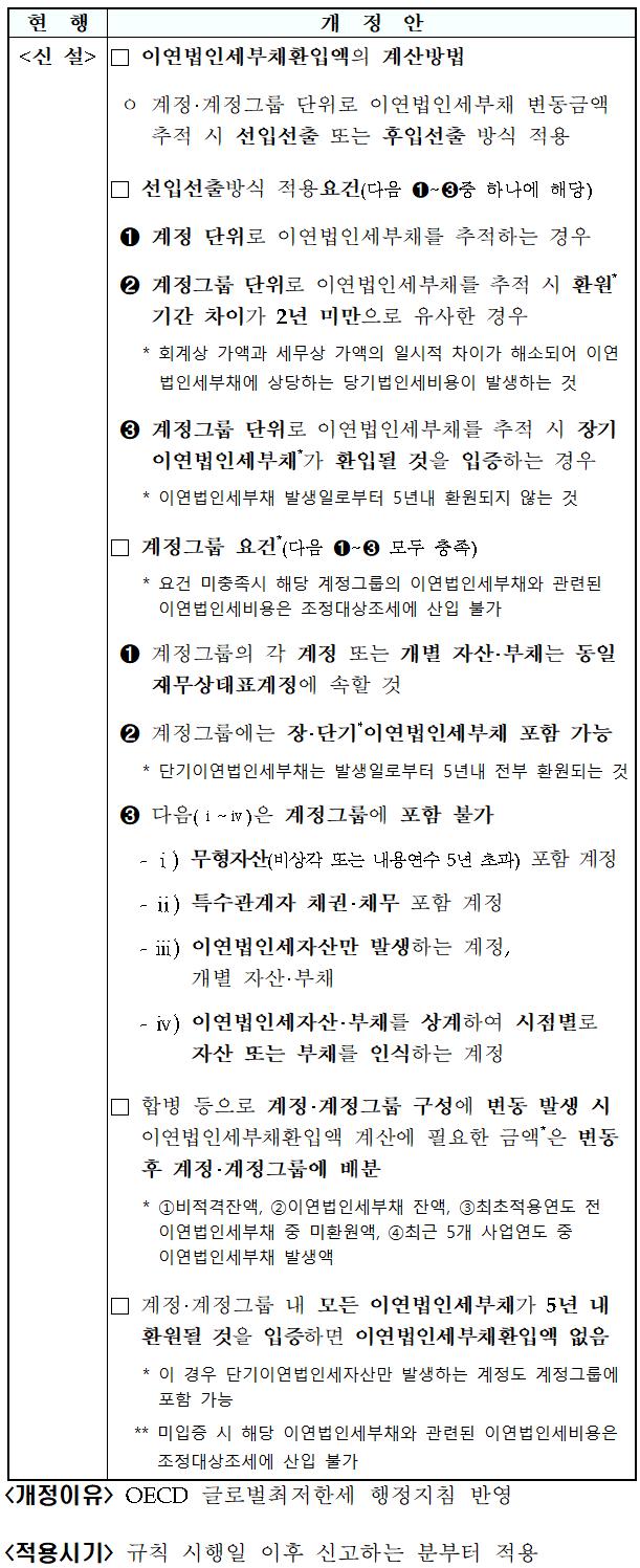 이연법인세부채환입액의 계산방법은 계정·계정그룹 단위로 이연법인세 부채 변동금액 추적 시 선입선출 또는 후입선출 방식을 적용한다. 5년내 환원되지 않는 이연법인세비용은 신고구성기업이 매년 선택, 5년서택해 조정대상조세에서 제외 가능하다.