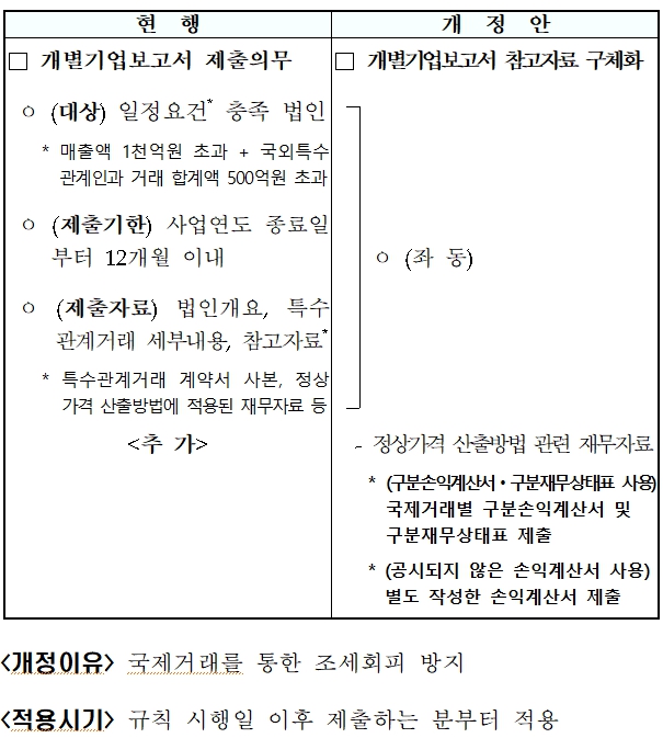 또한 개별기업보고서 참고자료에 정상가격 산출방법 관련 재무자료도 제출의무를 부여받는다.