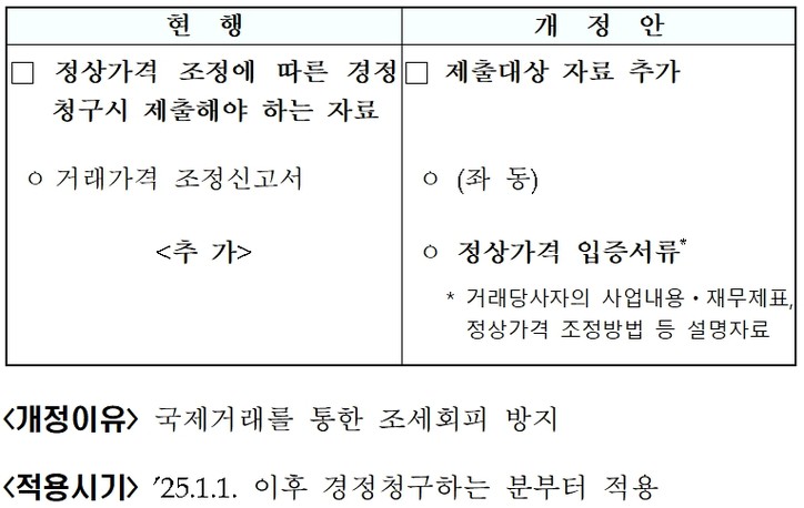 정부는 국제거래를 통한 조세회피 방지를 위해 정상가격 조정에 따른 경정청구시 거래가격 조정신고서 외에 ‘정상가격 입증서류’를 제출토록 했다. 거래당사자의 사업내용·재무제표, 정상가격 조정방법 등 설명자료가 여기에 해당한다.