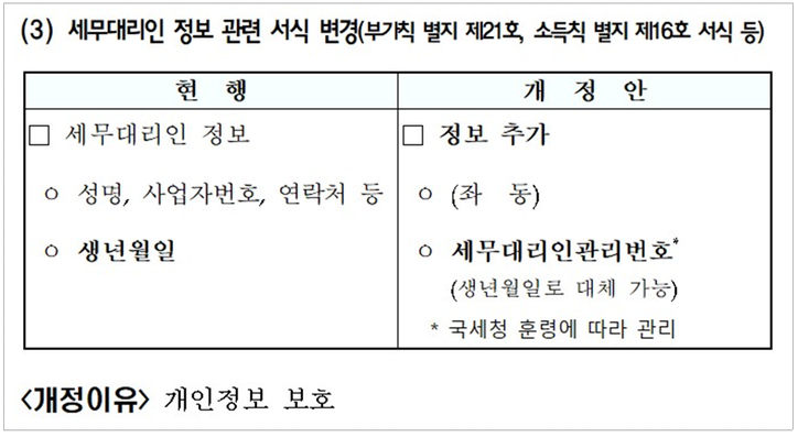 지난 `22년 말 전관예우 방지를 위해 각종 과세표준신고서에 세무대리인을 식별하기 위한 ‘생년월일’을 기재에 대해 정부가 개인정보 보호를 이유로 ‘세무대리인관리번호’를 사용할 수 있도록 개정한다. 이는 생년월일로 대체가 가능하며, `26년 1월1일 이후 서식을 제출하는 분부터 적용된다.