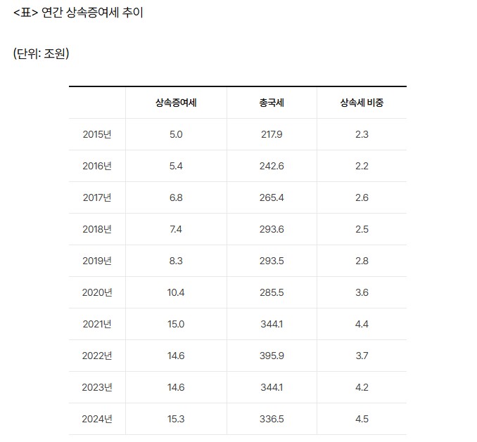 ◇ 상속증여세 15조, 총국세의 4.5%…10년새 2%대→4%대