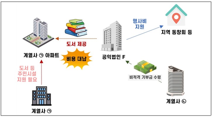 ○ 대기업 산하 공익법인 F는 계열사㉠(건설업체)이 아파트 주민시설에 제공할 수억 원 상당의 도서를 기부 명목으로 대신 지원하여 ㉠의 비용을 대납