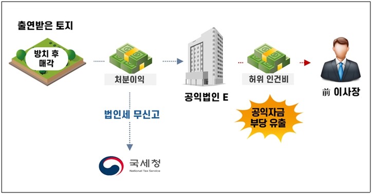 근무하지 않은 전 이사장에게 가공급여 수억원 지급, 출연받은 토지 방치 후 매각한 뒤 양도차익 무신고