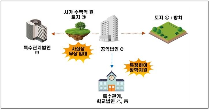 출연받은 토지를 특수관계법인에 사실상 무상임대,불특정다수가 아닌 특수관계법인에게만 장학 지원