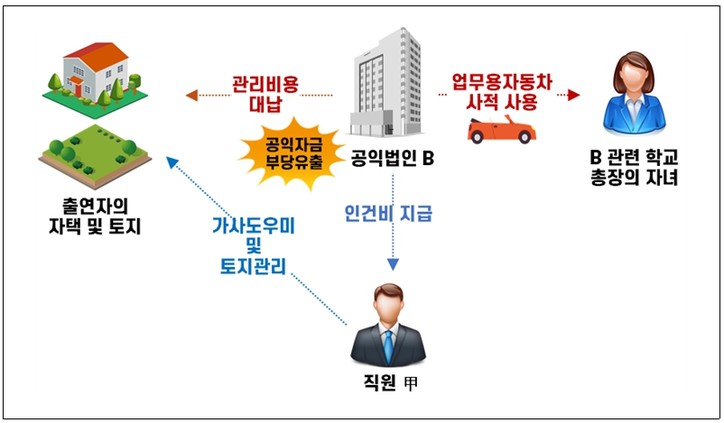 ○ 또한 출연받은 재산으로 취득한 고가의 업무용 승용차를 공익법인 B가 운영하는 학교 총장의 자녀에게 무상으로 사용하게 함