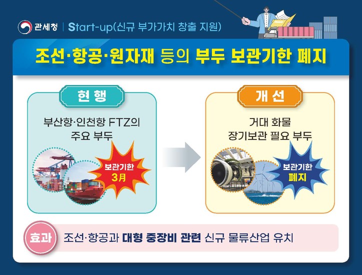 또한 조선·항공·플랜트 등 핵심산업의 거대 중장비와 원자재를 장기간 보관할 수 있도록, 자유무역지역 내 외국물품 보관기한 제한도 축소된다.
