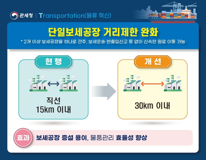 물류 혁신(Transportation)을 위해 단일보세공장 특허 시 거리제한 요건을 15㎞에서 30㎞로 완화한다.