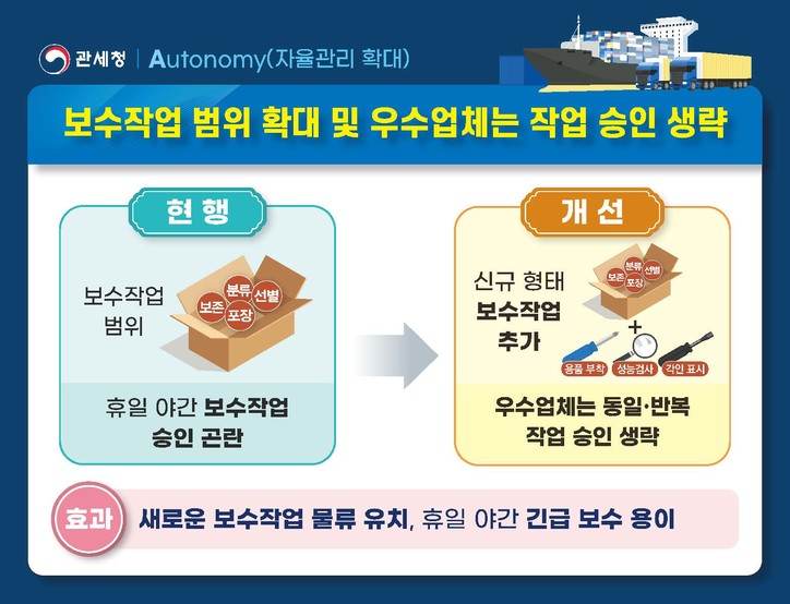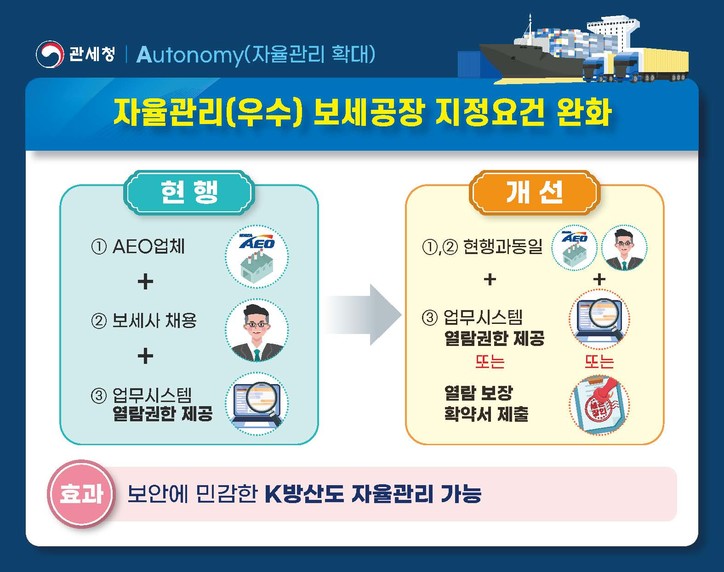 관세청은 우수 보세가공업체에 대한 자율관리 확대(Autonomy)를 위해 자율관리 보세공장 지정 요건을 완화할 방침이다.