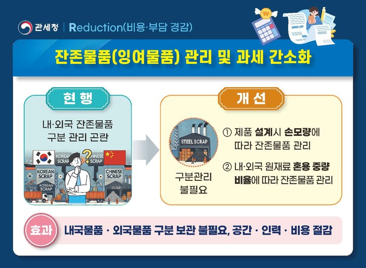이 밖에 비용·부담 경감(Reduction)을 위해 보세공장에서 제조에 사용하고 남은 철강 스크랩, 포장용 상자, 빈 용기 등 잔존물 관리도 대폭 간소화된다. 이에 조선업체가 선박을 건조하는 과정에서 나오는 외국산 철강 스크랩은 실물 중량을 측정할 필요 없이 설계도에서 산출되는 손모량대로 재고 관리하는 것을 허용해 관리 부담이 사라질 전망이다.