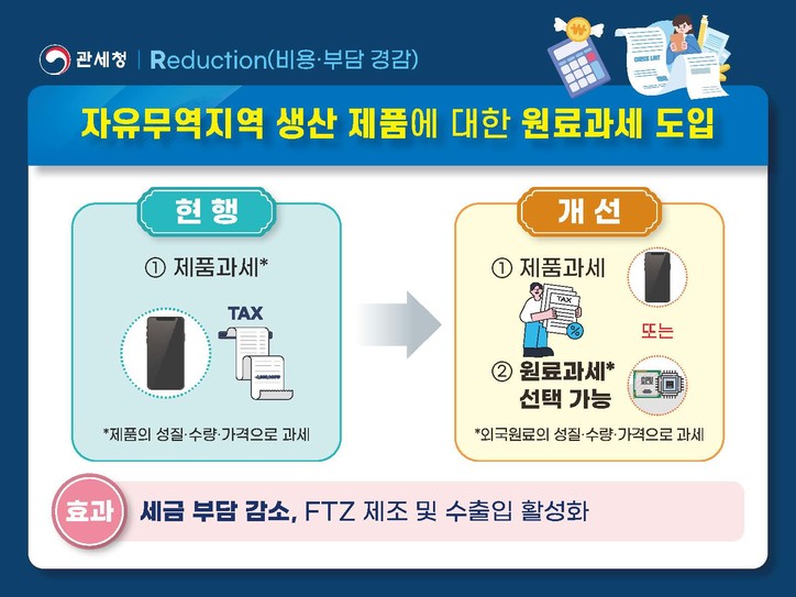 관세청 관계자는 “자유무역지역에서 생산한 제품을 수입시 제품에 대한 과세 또는 투입된 외국 원재료에 대한 과세 중 유리한 방식을 선택할 수 있도록 함으로써 기업의 관세 부담을 줄일 계획”이라며 “첨단·핵심 수출산업의 수출 경쟁력 향상과 국제시장 점유율 확대를 위해 산업현장의 목소리를 경청하고, 이를 반영한 과감한 규제혁신을 지속적으로 추진해 나가겠다”고 밝혔다.
