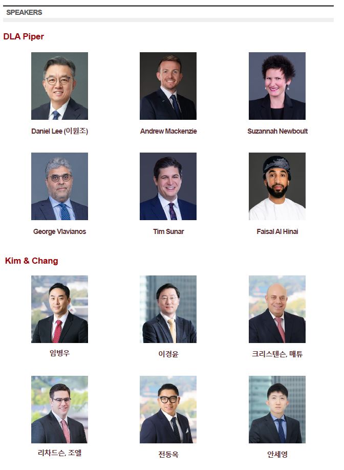 세미나는 이원조 디엘에이파이퍼 한국총괄 대표변호사와 임병우 김앤장 변호사의 개회사를 시작으로 진행되며 ▲중동 지역 투자 및 M&A: 주요 구조적 고려사항(발표자: 김앤장 이경윤 변호사, 안세영 외국변호사 및 DLA Piper 팀 수나르 파트너변호사) ▲중동지역에서의 클레임 관리 및 대응(발표자: 김앤장 매튜 크리스텐슨, 전동옥 외국변호사 및 DLA Piper 앤드류 맥켄지, 조지 블라비아노스 파트너변호사) ▲분쟁 해결을 위한 효과적인 전략(발표자: 김앤장 조엘 리차드슨 외국변호사 및 DLA Piper 수잔나 뉴볼트 파트너변호사, 파이살 알 히나이 오만변호사) 총 3개 세션으로 구성된다.