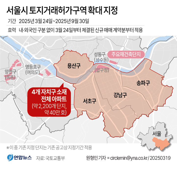 24일 0시를 기해 토지거래허가구역이 서울 강남·서초·송파·용산구로 확대됐다.