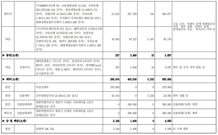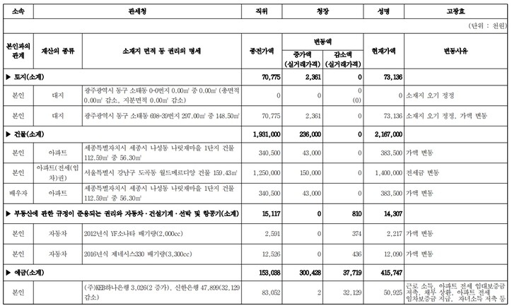 고광효 관세청장은 19억8400만원을 신고했다. 종전대비 5820만원이 증가한 것으로 이는 부동산의 가액 변동 및 임대차 전세금 변동 등이 사유로 나타났다.