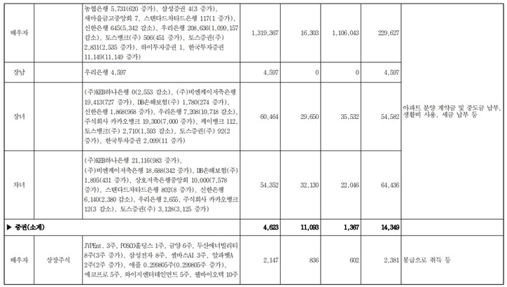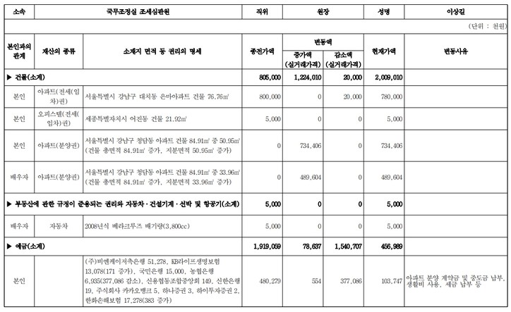 그러나 부동산에서는 오히려 강남구 청담동 아파트(분양권)를 배우자와 공동으로 취득해 종전대비 12억 이상의 증가를 보였으나 이로 인한 아파트 분양 계약금 및 중도금 납부, 세금 납부 등으로 예금이 큰 폭으로 줄어든 것으로 나타났다.