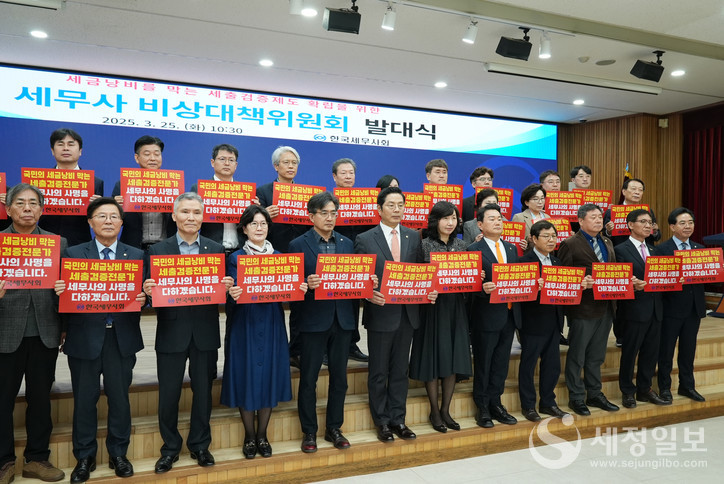 27일 한국세무사회(회장 구재이)는 지난 25일 한국세무사회 회관 6층에서 ‘세출검증전문가 수호 비상대책위원회’ 출범식을 가지고 공인회계사회와 양 단체 회장간 1대1 공개 토론을 제안했다.